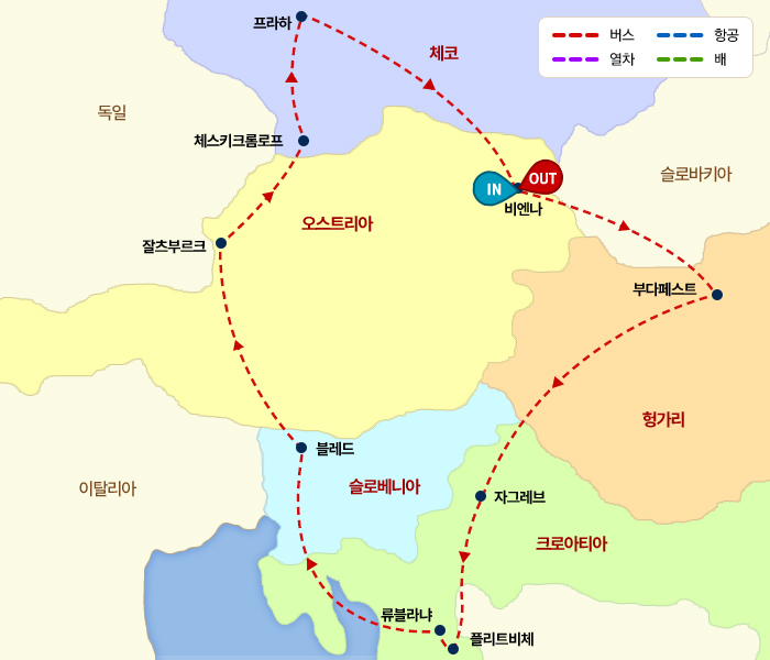 [ 주요관광지 ]- 아름다운 다뉴브강이 흐르는 ' 부다페스트 ' : 성이슈트반 대성당 (내부), 어부의 요새, 국회의사당 등- 낭만과 예술의 도시 ' 프라하 ' : 프라하 야간 투어, 프라하 성 (외관), 성비투스 성당 등- 음악의 나라 오스트리아의 수도 ' 비엔나 ' : 쇤부른 궁전 (내부) 및 정원, 케른트너 거리, 슈테판 성당 등- 사운드 오브 뮤직과 모차르트의 도시 ' 잘츠부르크 ' : 호엔잘츠부르크 성, 미라벨 정원 등