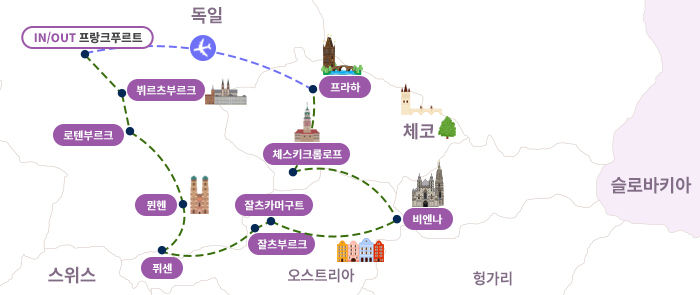 인천-프랑크푸르트-뷔르츠부르크(1)-로텐부르크-뮌헨(1)-퓌센-잘츠부르크(1)-잘츠카머구트-비엔나(2)-체스키크롬로프-프라하(2)-프랑크푸르트-기내(1)-인천
